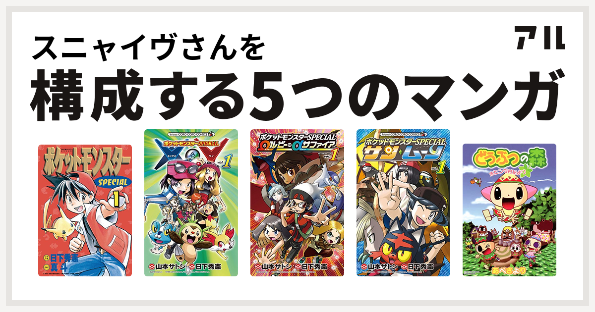 スニャイヴさんを構成するマンガはポケットモンスタースペシャル ポケットモンスターspecial X Y ポケットモンスターspecial Wルビー Aサファイア ポケットモンスターspecial サン ムーン どうぶつの森 ホヒンダ村だより 私を構成する5つのマンガ アル